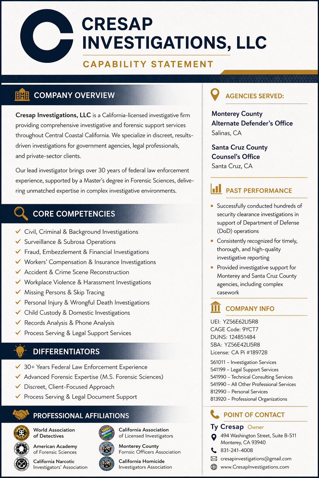 As a California Bureau of Security and Investigative Services (BSIS) Certified Business, CRESAP INVESTIGATIONS offers professional investigative services with a focus on the